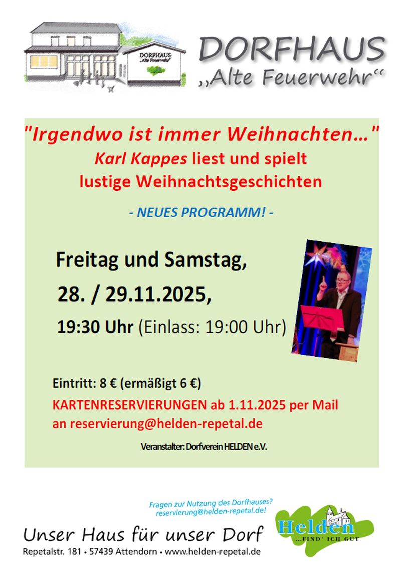 Am kommenden Mittwoch, 19. November 2025 findet in Helden wieder ein Gesellschaftsspiele-Nachmittag statt, zu dem alle Senioren und Seniorinnen herzlich eingeladen sind. Die Veranstaltung beginnt um 15:30 im Dorfhaus „Alte Feuerwehr“ und endet gegen 18:00 Uhr. Die Organisatoren vom Dorfverein freuen sich auf einen geselligen Nachmittag mit unterhaltsamen Gesellschaftsspielen und Kaltgetränken. Die Teilnehmenden werden gebeten, […]
