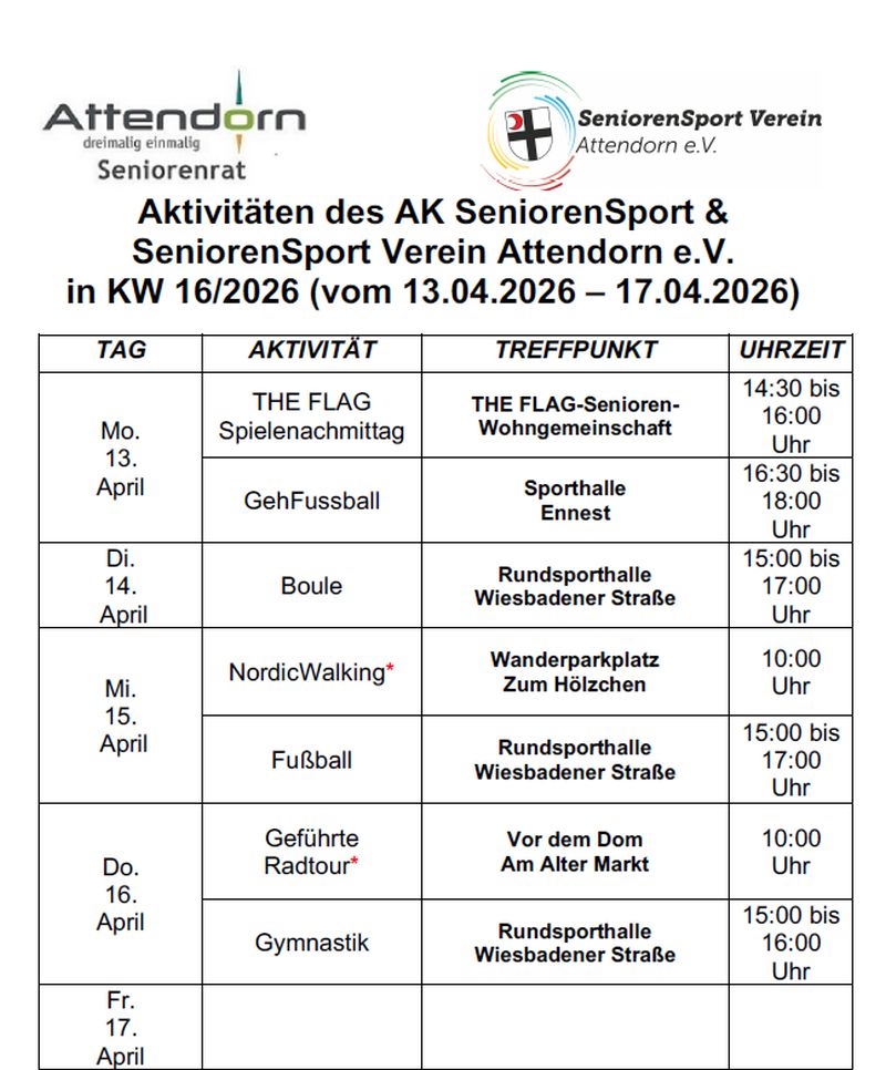 Programm SeniorenSportverein Attendorn 13. – 17. April