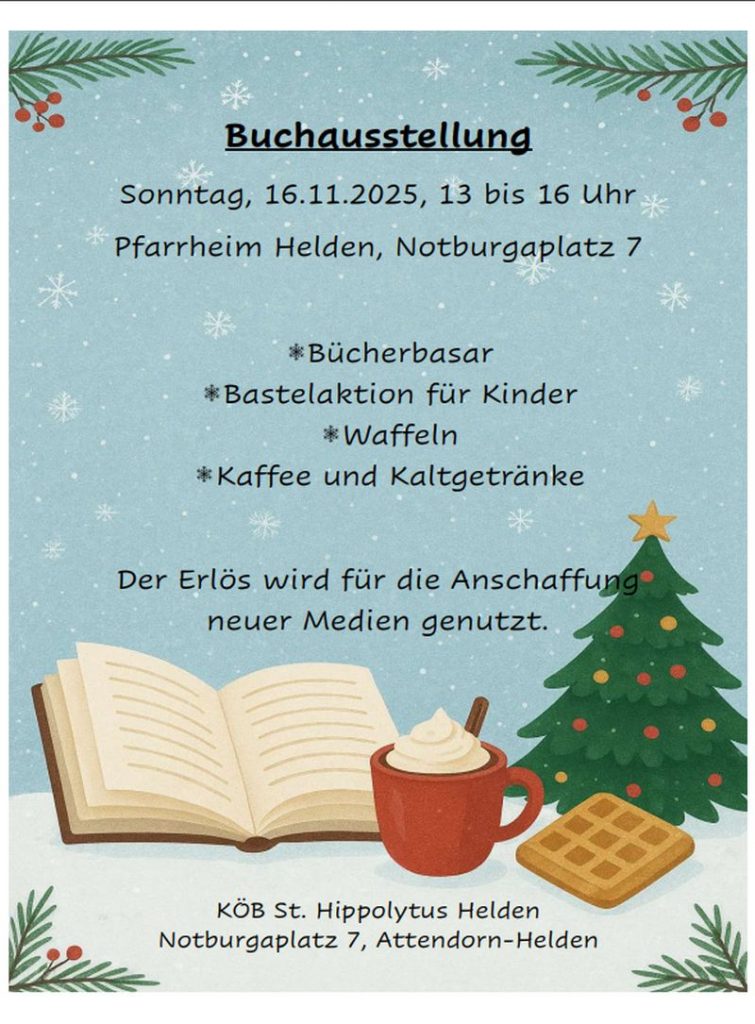 Die Katholische öffentliche Bücherei St. Hippolytus Helden präsentiert am 16. November 2024 in der Zeit von 13 bis 16 Uhr im Pfarrheim (Notburgaplatz 7, 57439 Attendorn-Helden) eine Medienauswahl mit Büchern für alle Altersgruppen und aus unterschiedlichen Rubriken sowie Kalendern und Spielen.